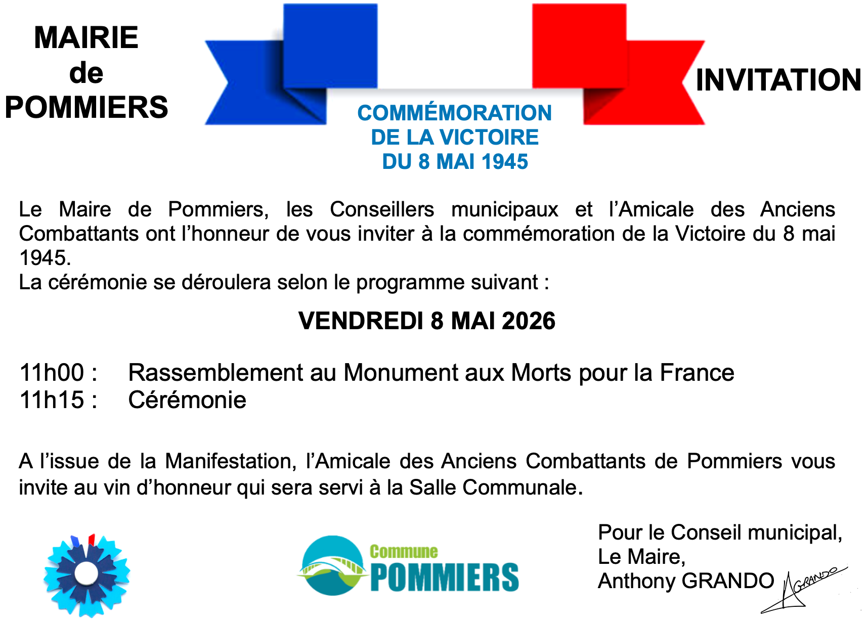 CLe Maire de Pommiers, les Conseillers municipaux et l’Amicale des Anciens combattants ont l’honneur de vous inviter à la Commémoration de la Victoire du 8 mai 1945.